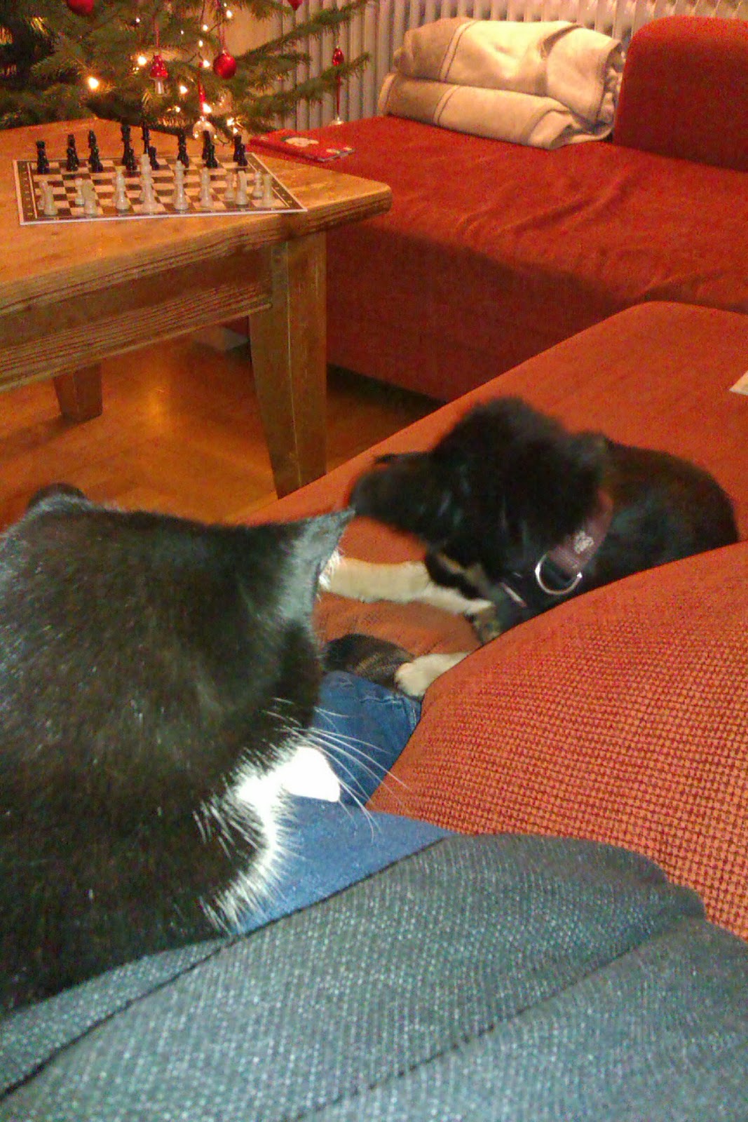 Der Trubel des ersten Weihnachtstages ist vorbei und ich setze mich wohlig seufzend auf unser Sofa. Die Jungs (und zwar alle drei) spielen "Magic" und ich möchte die Zeit nutzen, um mein Buch zu Ende zu lesen. Meine kleine Seelentrösterin kommt von irgendwoher angeschlichen und nach ein paar zaghaften Trettlern findet sie endlich Platz auf meinem Schoss. Ich greife nach meinem Buch und lese ein paar Zeilen. Julie liegt auf ihrem Kissen und beobachtet uns von dort aus mit traurig hängenden Hundeohren. Langsam steht sie auf und mit einem Sprung ist sie auf dem Sofa. Ganz behutsam kommt sie näher, Bremse immer im Visier und lässt sich dann mit einem Seufzer auf meine Füße nieder. Ich halte den Atem an. Doch nichts geschieht: Hund und Katze vereint auf dem Sofa. Echt süß!!