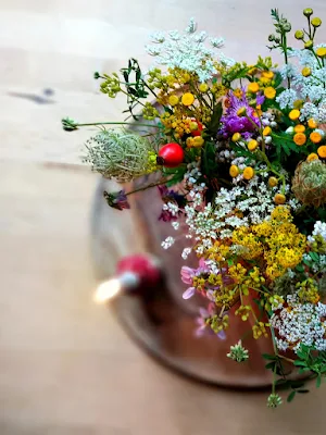 Guten Morgen, meine Lieben. Schön, dass Ihr heute zu mir gefunden habt. Die letzten Tage hatten es in sich und mir fehlte einfach die Zeit mich vor den Rechner zu setzen. Ich musste die Urlaubsvertretung bei uns im Weltladen machen und auch sonst weiß ich gerade nicht, wie ich alles unter einen Hut bekommen  kann. Nichtsdestotrotz wollte ich mich kurz hier bei Euch melden. Was so alles geschehen ist möchtet Ihr wissen? Mein Göttergatte hatte Geburtstag. Er ist tatsächlich genullt. Der junge Hüpfer.. grins! Gefeiert haben wir das nur im ganz engen Familien- und Freundeskreis. So richtig zum Jubeln war/ist uns nicht. Denn leider fehlte an diesem Tag einer seiner besten Freunde, da dieser sich in einem weitentfernten Krankenhaus ins Leben zurück kämpft. Das kleine Feldrainsträußchen habe ich übrigens meinem Herzallerliebsten auf den Gabentisch gestellt. Das Sträußchen hält sich überaus gut und ich werde es wahrscheinlich sogar noch für meine Leiste in der Küche trocknen. Was sonst noch so war? Nachdem wir (wieder!) alle Brombeersträucher im hinteren Gartenbereich entfernt haben, konnten wir endlich drei ehemalige Transportkisten aufstellen. Bis zum Frühjahr wollen wir sie mit Schnittgut und Hühner-Mist auffüllen und im Frühjahr geht's dann mit unserem Versuch "Permakultur" los. Ich bin gespannt. Ach, und dann habe ich noch meinen Post "Kleine Apfelernte" um einige Apfelrezepte erweitert. Da so viele Fragen kamen was wir aus und mit den Äpfeln machen. Also, wer noch auf der Suche nach einem köstlichen Rezept ist, darf gerne zwei Post zurück klicken. Was ist denn bei Euch so passiert? Erzählt doch mal!