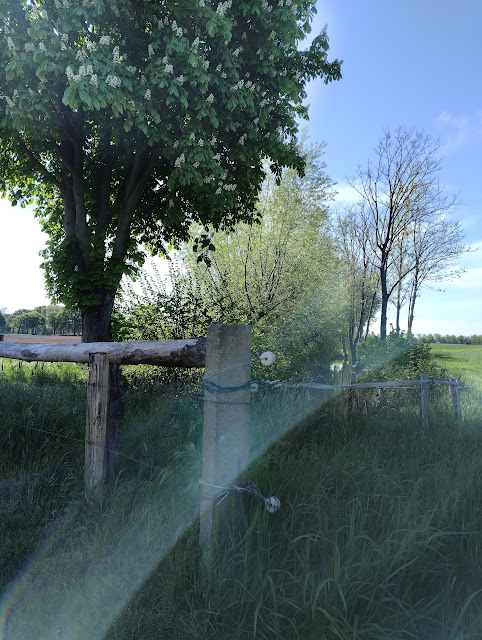 Heute mache ich wieder bei der "12tel Blick - Fotoaktion" von Eva aka "verfuchstundzugenäht" mit. Für meinen diesjährigen 12tel Blick sind wir direkt hinter dem Dachsberg in den Feldern unserer Klosterstadt unterwegs. Ich gebe zu um die Bilder für den April bin ich spät dran, allerdings sind die Fotos noch in meiner letzten Urlaubswoche entstanden. Die Kastanie am Hoerstgener Kendel hat einen richtigen Schub bekommen und aus dem zarten grünen Laub im März ist ein kräfitges Grün geworden. Auch die Blüten haben sich prächtig entwickelt und stehen wie Kerzen aufrecht an den Ästen. Das Gras zu ihren Füßen ist so hoch, dass man die Pumpe im Kendel nicht mehr sehen kann. Auch auf der Weide hinterm Gatter steht das Gras kniehoch und der Blick zum Birnenbaum ist unspektalär. Die kurze Blühphase habe ich leider für den April-Blick verpasst und nur wenige weiße Blüten leuchten im schnell ausgetriebenen Grün. Allerdings habe von beiden Bäumen Aufnahmen der Blüten aus einer anderen Perspektive bereits Mitte April gemacht. Außerdem habe ich noch zwei Nebelbilder am 11.04.2025 gemacht. Allerdings war dieser grauer Tag eine Ausnahme im April. Den ganzen April über schien die Sonne warm von einem blitzeblauen Himmel herunter. Die zeige ich Euch gerne im Anschluss.
